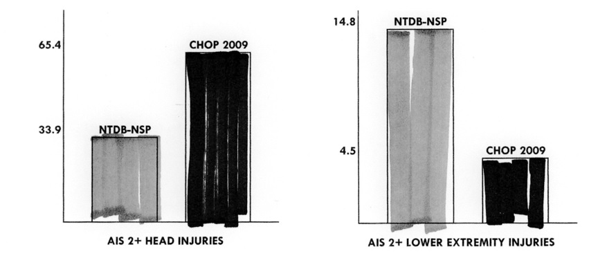 A comparison such as the above of the injury profiles of the State Farm database with those of the U.S. National Trauma Data Bank (NTDB) for the same interval would have indicated there was something very wrong with the study; a relatively simple arithmetic extrapolation based on that comparison would have indicated a probability that booster seats more than doubled head injuries, consistent with the recent studies at the UAB School of Public Health.